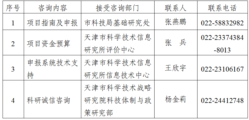 为便于项目负责人和各单位申报和择优推荐2025年天津市自然科学基金项目,市科技局自项目指南发布之日起至2025年4月30日下午17:00前(法定节假日和公休日除外),开通申报咨询电话,详见下表。