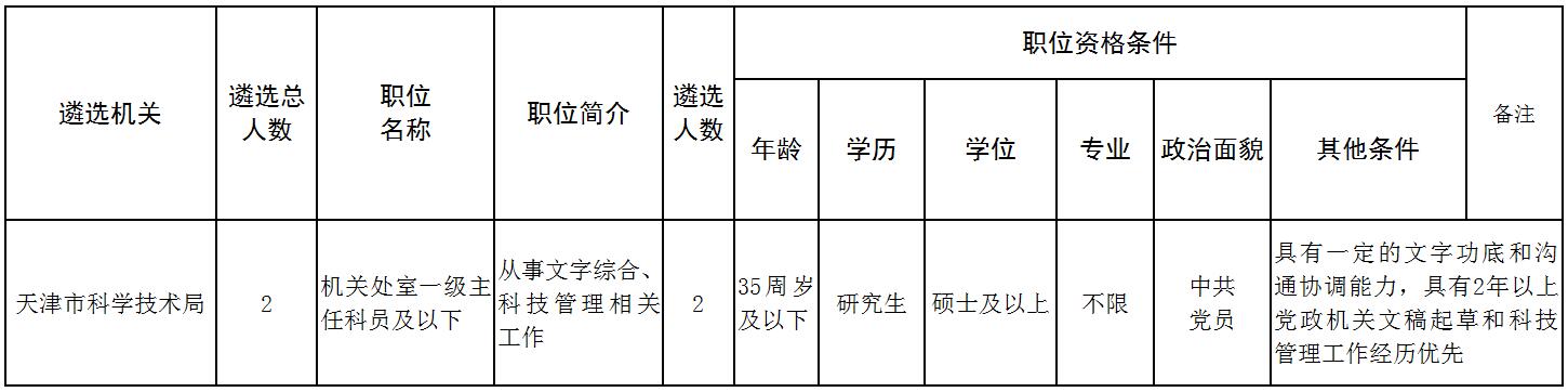为进一步拓宽选人视野,健全来自基层的公务员培养选拔机制,贯彻落实对疫情防控一线表现突出的基层干部激励和关爱措施,中共天津市市委组织部决定开展天津市2020年公开遴选和公开选调公务员工作。天津市科学技术局计划遴选2名干部,职位条件如下,详情请登录rsks.hrss.tj.gov.cn。