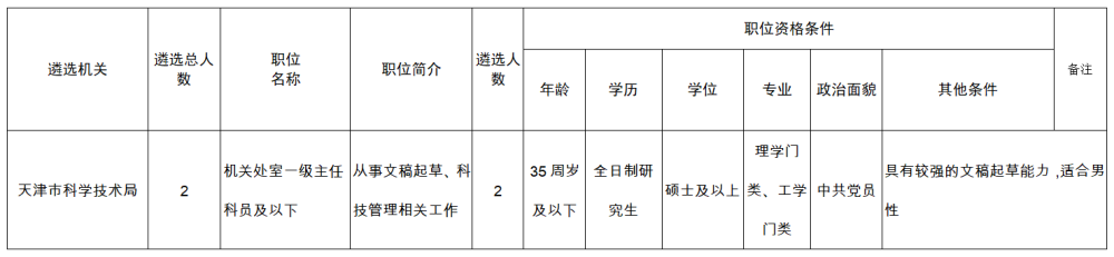 为进一步拓宽选人视野,健全来自基层的公务员培养选拔机制,中共天津市市委组织部决定开展天津市2021年公开遴选和公开选调公务员工作。天津市科学技术局计划遴选2名干部,职位条件如下。