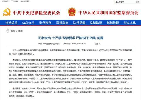 为进一步贯彻落实中央纪委和市委部署要求,巩固拓展落实中央八项规定精神成果,天津市纪委监委发出《关于持之以恒正风肃纪严防元旦春节期间“四风”问题反弹的通知》。