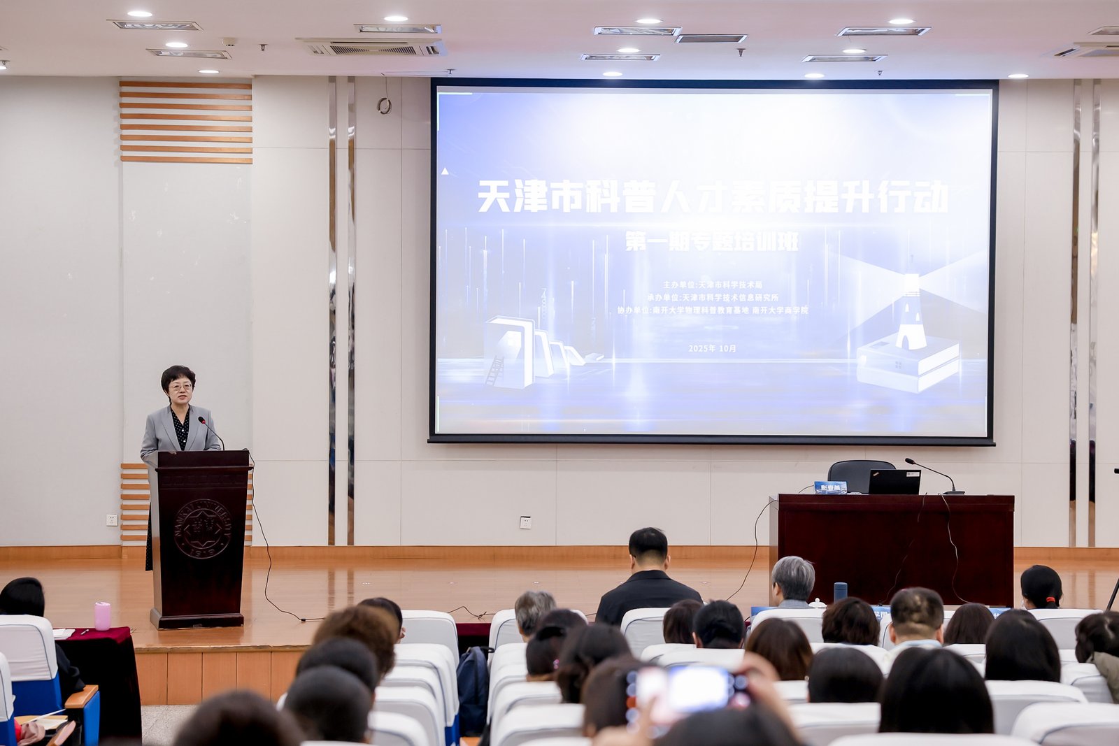 为深入贯彻落实新修订的《中华人民共和国科学技术普及法》(以下简称《科普法》),加强我市科普人才队伍建设,打造专业化科普人才方阵,10月16日,由天津市科学技术局主办,天津市科学技术信息研究所承办,南开大学物理科普教育基地和南开大学商学院协办的天津市科普人才素质提升行动第一期专题培训班成功举办。各区科技局、市级科普基地相关负责同志200余人参加培训。